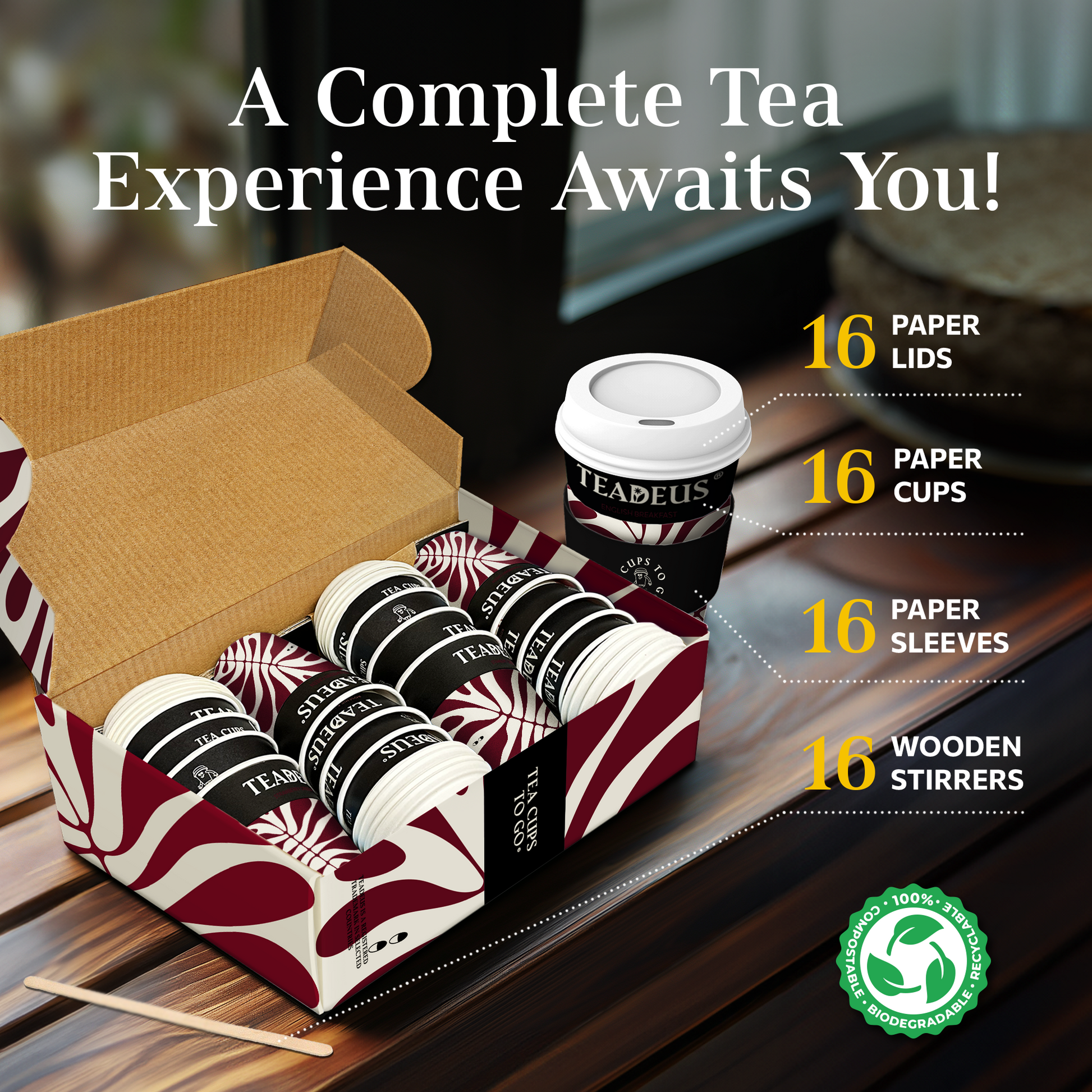With our tea cups, you'll also get all you need to enjoy your tea anywhere and anytime. The set includes a wooden stirrer, a paper lid, and a paper sleeve for each cup.