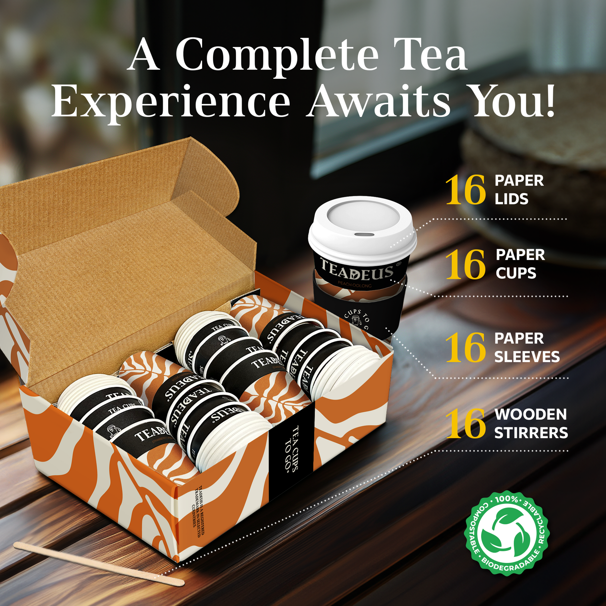 With our tea cups, you'll also get all you need to enjoy your tea anywhere and anytime. The set includes a wooden stirrer, a paper lid, and a paper sleeve for each cup.